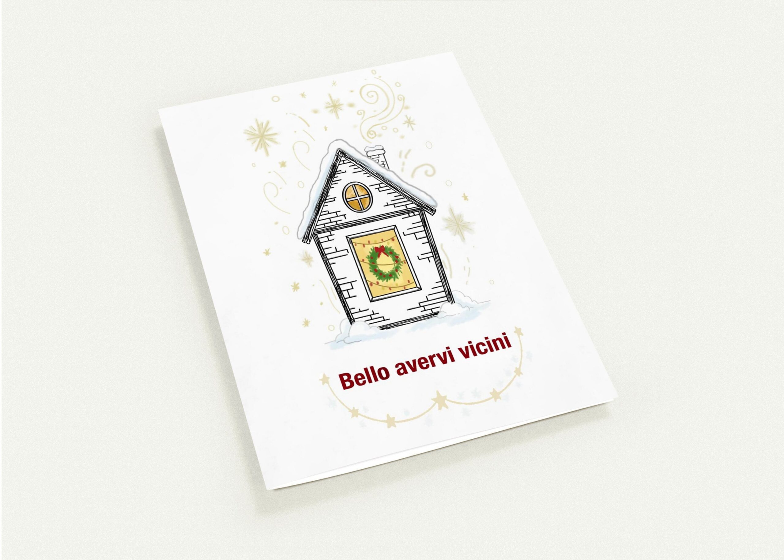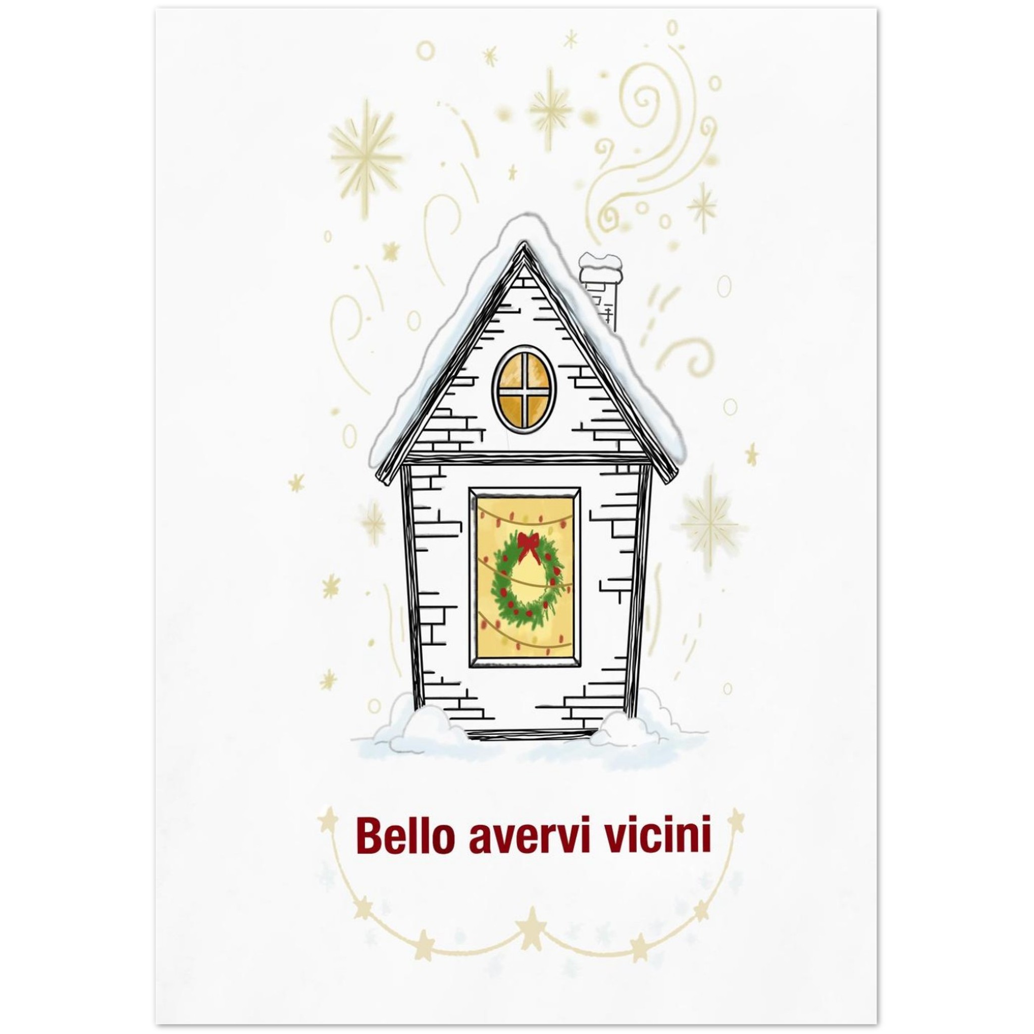 Biglietti d’auguri invernali con illustrazione casa sulla neve e scritta Bello avervi vicini -