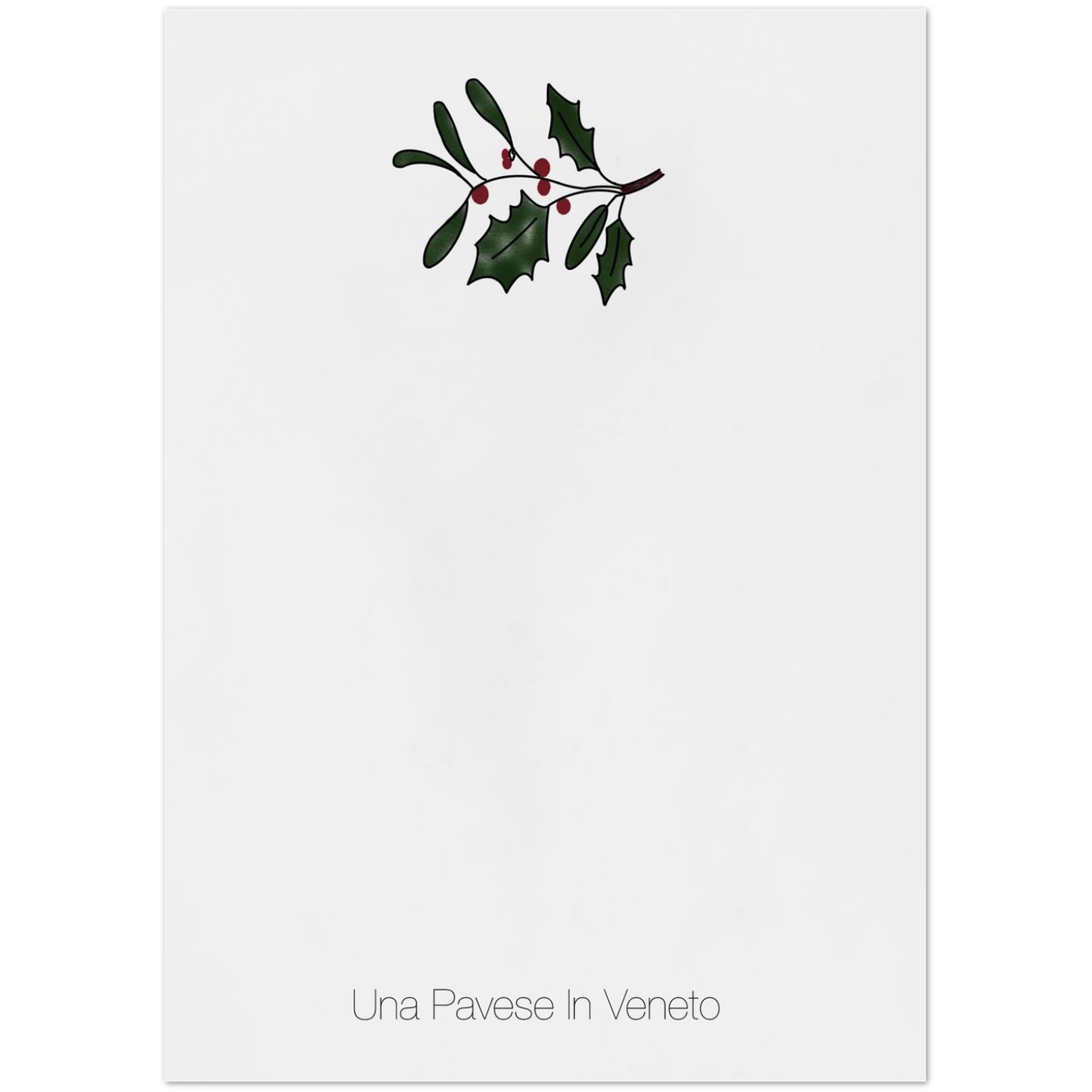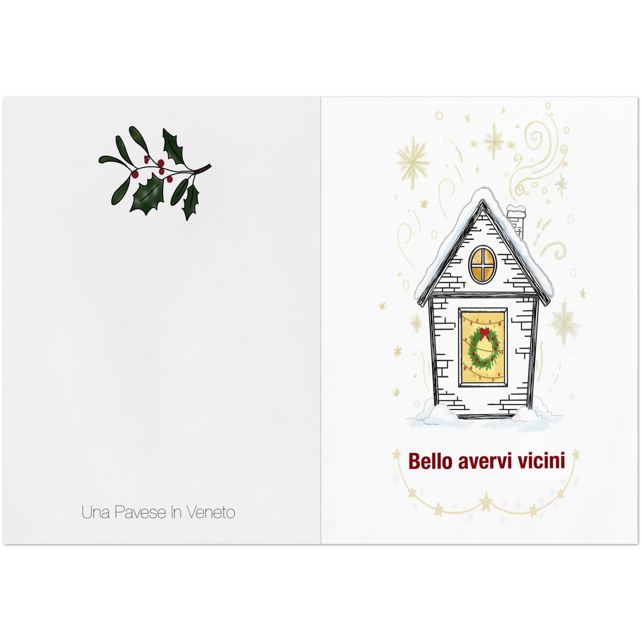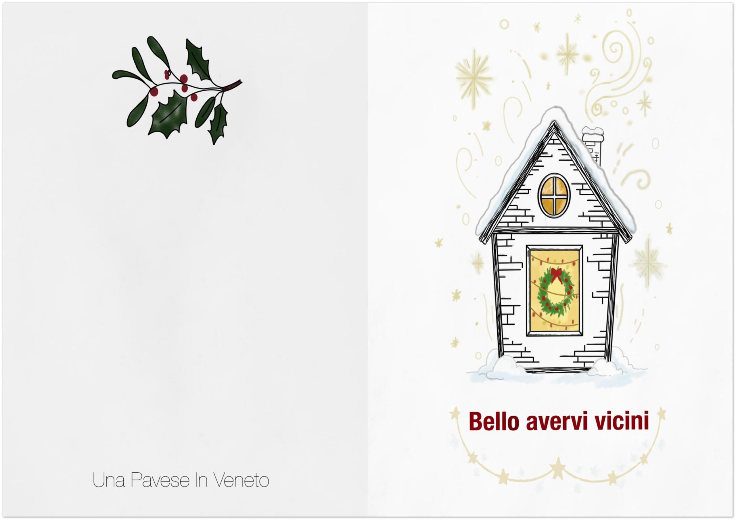 Retro dei biglietti d’auguri invernali con logo Una Pavese in Veneto e ramoscello di agrifoglio